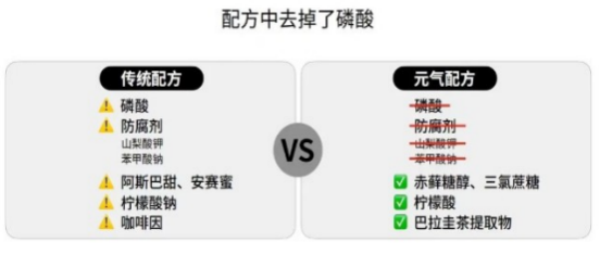 此外,升級版包裝還在商標旁增加了“氣更足”的紅色字樣,并新增了0山梨酸鉀、0苯甲酸鈉的標識,以強調(diào)元氣森林0防腐劑的決心。