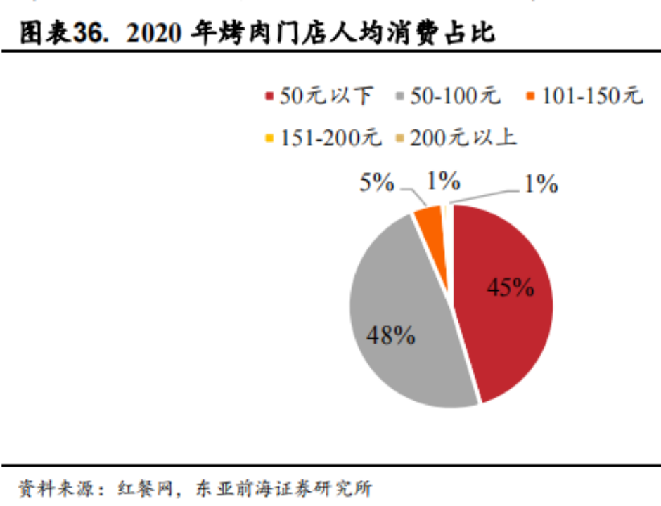 據(jù)紅餐網(wǎng)數(shù)據(jù),烤肉市場人均消費(fèi)區(qū)間一般在100元以下,還有50元上下區(qū)間的,兩種價格區(qū)間各占一半。