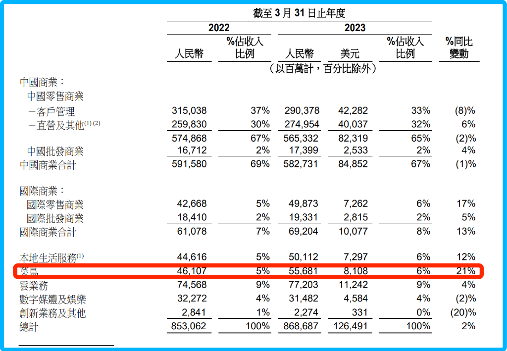 特別是在剛剛過去的2023財(cái)年(截至2023年3月31日止的一年內(nèi)),菜鳥以21%的營收同比增速,超越中國商業(yè)、國際商業(yè)、本地生活、云業(yè)務(wù)、數(shù)字媒體及娛樂等,領(lǐng)跑阿里六大集團(tuán)。