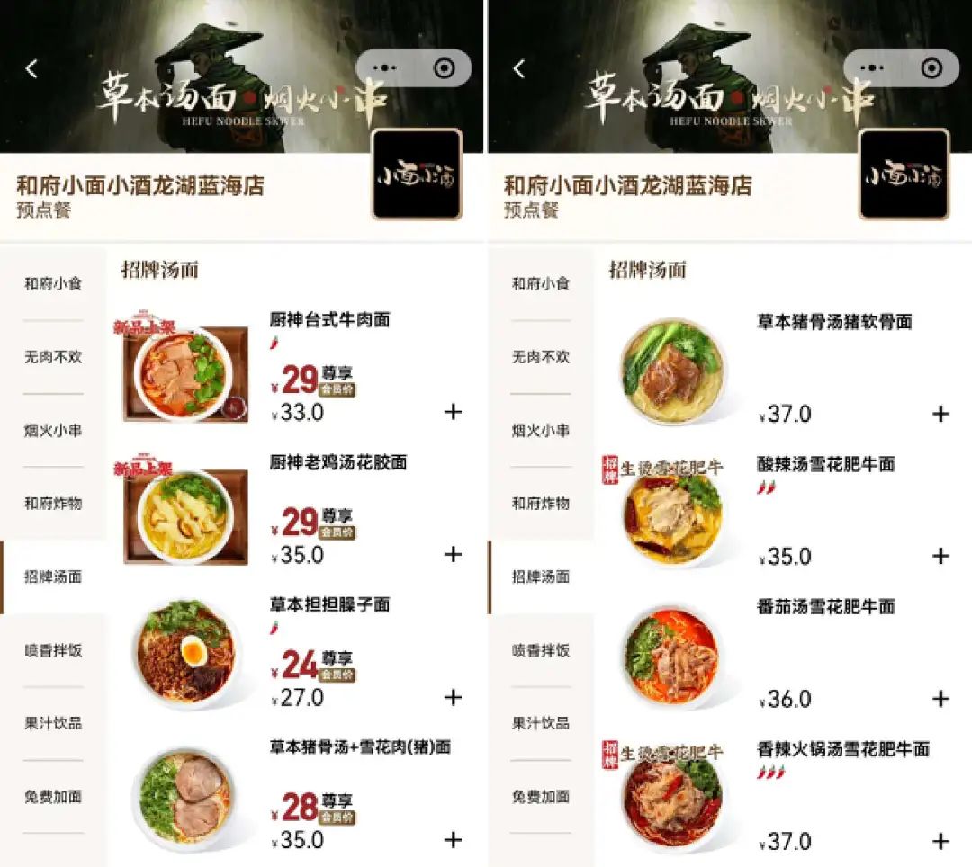 如果是會員,這三款面的價格則都“控制”在了30元以內(nèi),這一點在電子菜單中也十分明顯,新品的會員尊享價格都用紅色字體加粗,十分醒目;而經(jīng)典招牌則均為30+,比如其經(jīng)典款草本番茄湯豬軟骨面(37元)、酸辣湯雪花肥牛面(35元),香辣火鍋湯雪花肥牛面(37元)。