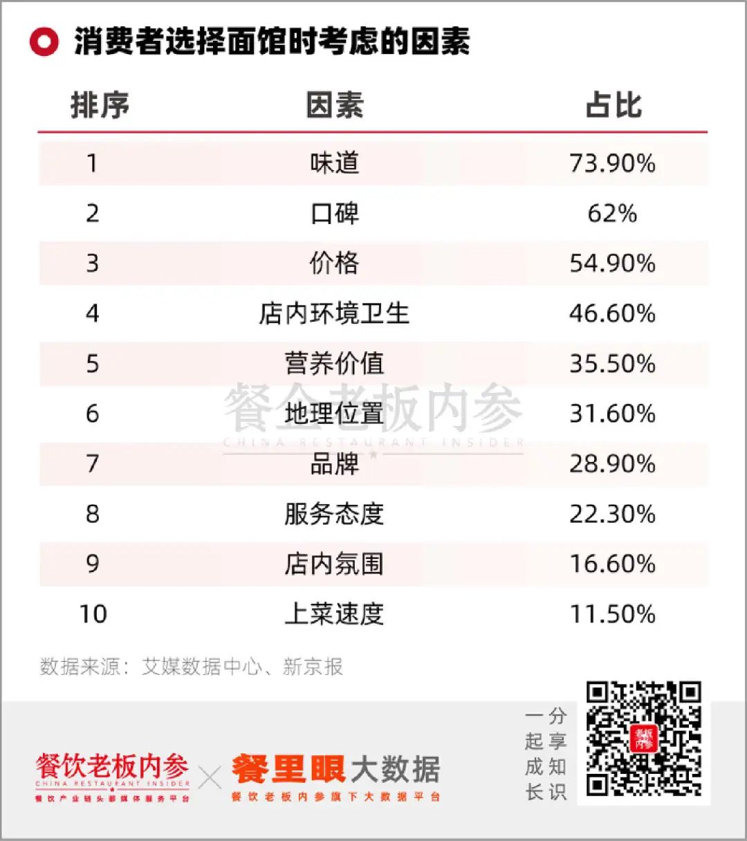 同時,“消費者選擇面館時考慮因素”中,“味道”占比73.9%,“價格”占比54.9%,分別名列第一和第三因素!捌放啤眲t僅僅排在第七位,占比28.9%。