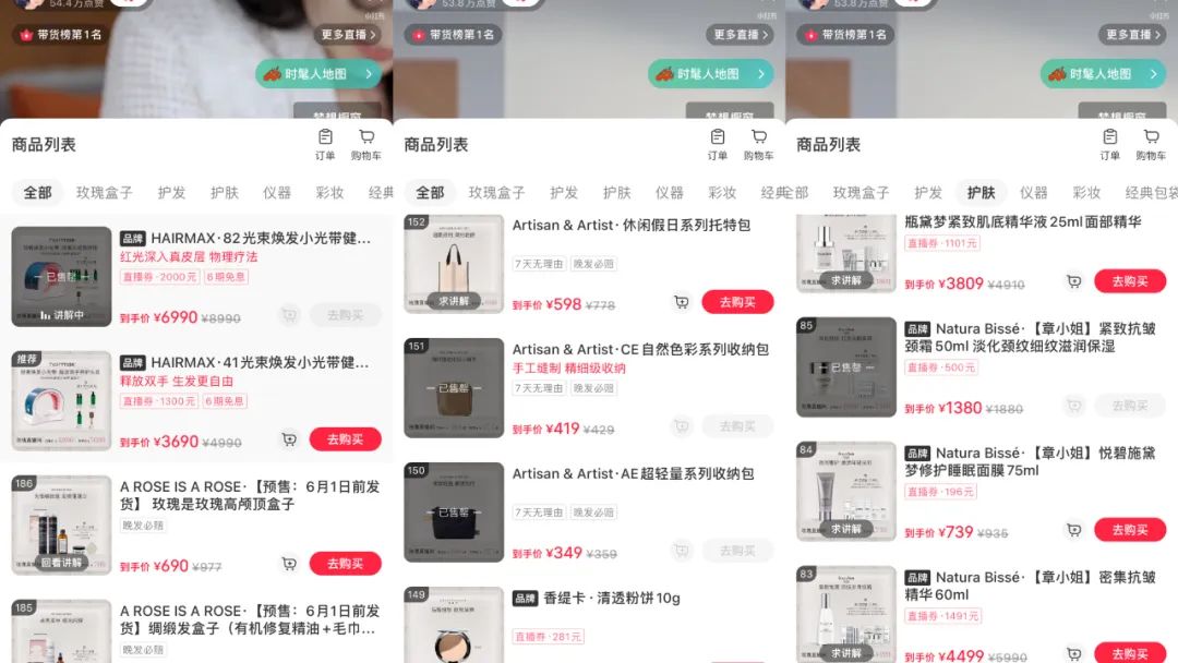 整場直播,186個(gè)品,覆蓋護(hù)發(fā)、護(hù)膚、儀器、彩妝、經(jīng)典包袋等多個(gè)品類。值得關(guān)注的是,本次直播,章小蕙拿出了一年只上架兩次的“玫瑰盒子”(章小蕙個(gè)人品牌的禮盒),其為護(hù)發(fā)、護(hù)膚商品組合套裝,包括高顱頂盒子、瘦腿盒子、夏日體香盒子等系列,覆蓋MALIN+GOETZ、MY.ORGANICS等多個(gè)小眾品牌,每個(gè)盒子都做了跨品牌的組合SKU,價(jià)格在400元至千元不等。