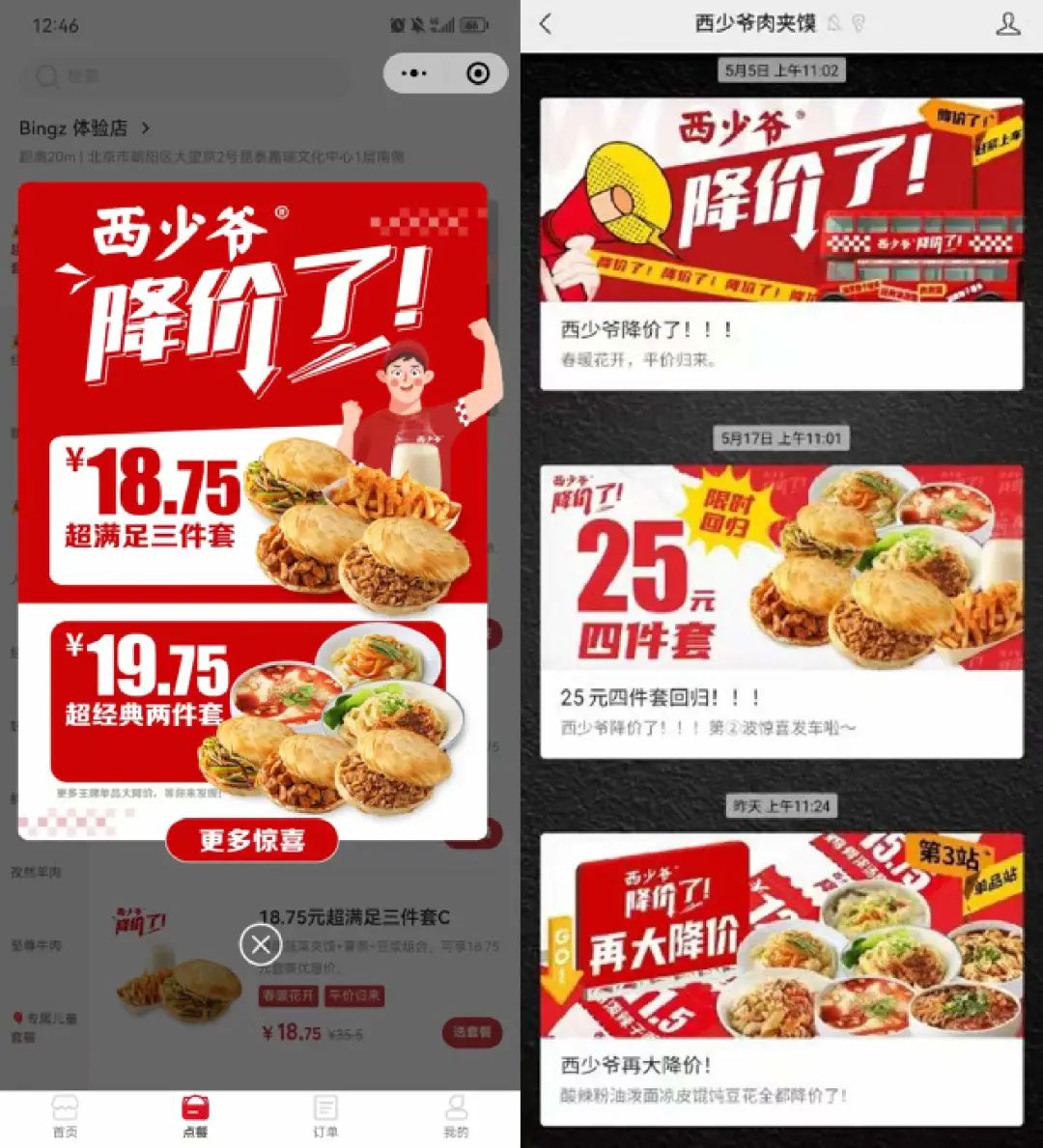 5月,西少爺官方公眾號連發(fā)三條推文,分別為:西少爺降價、25元套餐回歸、西少爺再大降價。