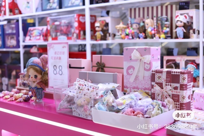 首店整體以粉色為主色調(diào),墻體外立面上方貼了一圈冬己娃娃的形象貼紙,中間位置貼著“隨時(shí)隨地 冬己陪你”的slogan。門(mén)店內(nèi)部各式各樣的娃娃將展示柜塞得滿(mǎn)滿(mǎn)當(dāng)當(dāng)。