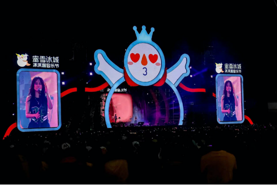 對(duì)于品牌而言,音樂(lè)節(jié)現(xiàn)場(chǎng)就是一個(gè)三維立體的宣傳空間,活動(dòng)標(biāo)志、舞臺(tái)場(chǎng)地、橫幅和易拉寶等宣傳物料、遮陽(yáng)傘等設(shè)施、周邊產(chǎn)品等,都可以充當(dāng)品牌與消費(fèi)者的宣傳媒介。在雪冰城冰淇淋音樂(lè)節(jié)現(xiàn)場(chǎng),8米高的雪王氣模、蹦迪的雪王人偶等形象足夠吸睛,頻頻引發(fā)觀眾歡呼。