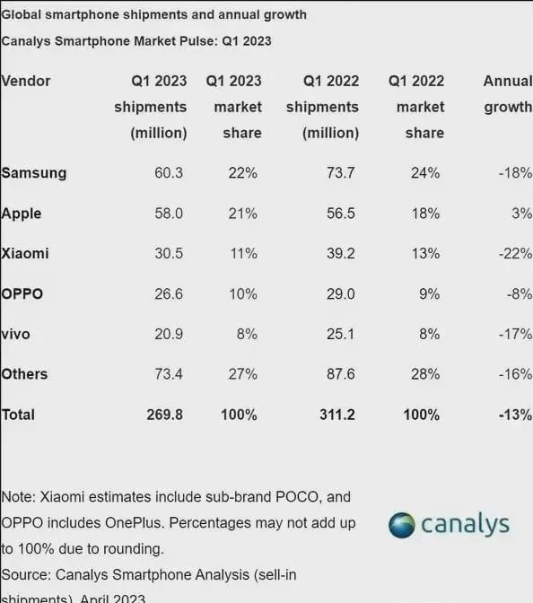 2023年,受消費信心不足、購買力疲軟等因素影響,全球智能手機市場需求呈現(xiàn)疲軟狀態(tài)。據(jù)Canalys數(shù)據(jù),今年一季度全球智能手機銷量下滑了13.3%,而且目前市場回暖拐點還未出現(xiàn)。毫無疑問,小米正處于一個低谷期。