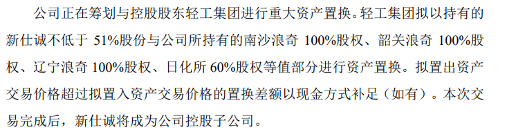 5月13日,廣州浪奇發(fā)公告稱,控股股東廣州輕工工貿(mào)集團(tuán)有限公司(下稱“輕工集團(tuán)”)擬以持有的廣州新仕誠企業(yè)發(fā)展股份有限公司(下稱“新仕誠”)不低于51%的股份與廣州浪奇旗下的南沙浪奇100%股權(quán)、韶關(guān)浪奇100%股權(quán)、遼寧浪奇100%股權(quán)、日化所60%股權(quán)等值部分進(jìn)行資產(chǎn)置換。