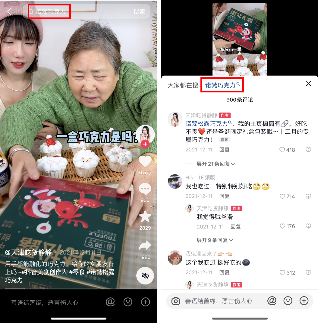 巧克力品牌諾梵的品牌推廣總監(jiān)李劍鋒告訴《窄播》,抖音貨架電商目前對他們最大的用途是搜索流量的承接,但與淘寶天貓的主動搜索不同,他們的搜索流量從占比來說更多來自于投放達(dá)人后帶來的「看后搜」。