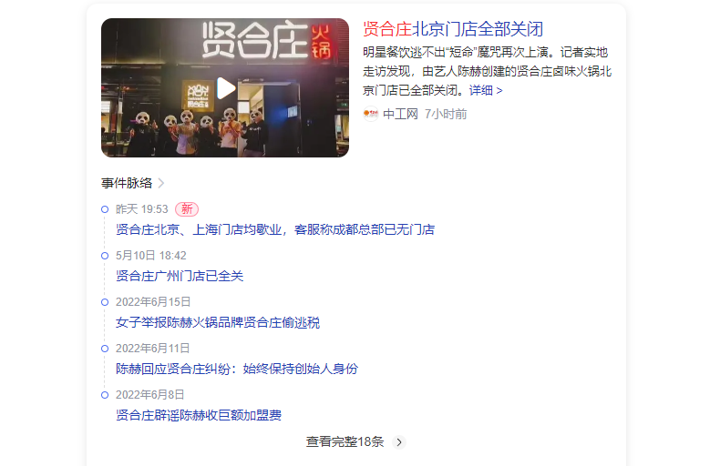 紅餐網(wǎng)盤點(diǎn)發(fā)現(xiàn),賢合莊在加盟店管理、經(jīng)營(yíng)方面的問(wèn)題屢屢被曝光,再加之后來(lái)愈演愈烈的加盟商維權(quán)事件、陳赫退出賢合莊股東等負(fù)面輿論的輪番發(fā)酵,導(dǎo)致賢合莊的人氣開始一路走低,全國(guó)多地曾紅火一時(shí)的賢合莊門店也相繼關(guān)閉。