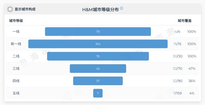目前,H&M在中國(guó)市場(chǎng)中也是在不同層級(jí)城市市場(chǎng)中布局較為全面的。根據(jù)極海品牌監(jiān)測(cè)數(shù)據(jù),H&M已經(jīng)把門店開(kāi)進(jìn)了近半的三線城市,近四成的四線城市。幾乎分布到全國(guó)各地的萬(wàn)達(dá)廣場(chǎng)也成為了這一階段H&M合作的重要選擇,像撫順、佳木斯等五線城市,H&M就是通過(guò)與萬(wàn)達(dá)商場(chǎng)合作等方式實(shí)現(xiàn)入駐。