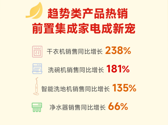 此外,得益于618期間免費(fèi)的“局改”服務(wù),嵌入式洗碗機(jī)銷量同比增長了181%,服務(wù)成為銷售增長的重要助力。洗烘一體機(jī)、智能洗地機(jī)等“懶人”必備的家電也迎來爆發(fā),銷量同比分別增長了238%和135%。