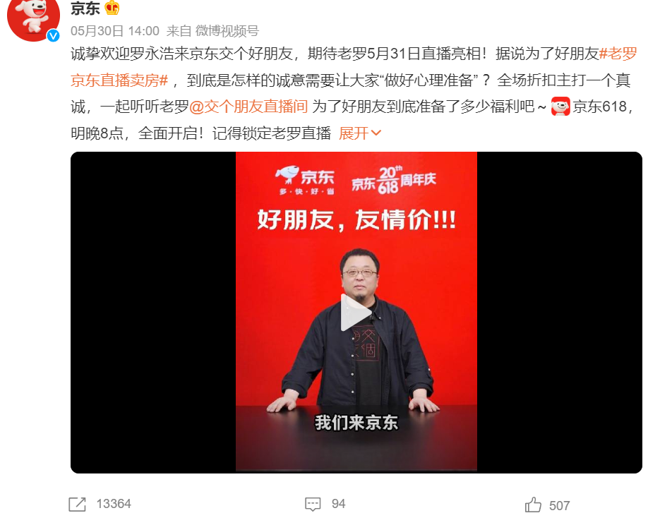 在淘寶直播賣完衛(wèi)星的羅永浩,5月31日,去京東直播賣房了。