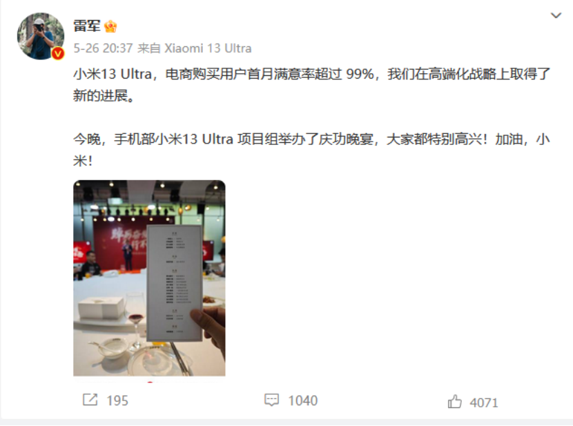 “小米13 Ultra,電商購買用戶首月滿意率超過 99%,我們在高端化戰(zhàn)略上取得了新的進(jìn)展。今晚,手機部小米13 ultra 項目組舉辦了慶功晚宴,大家都特別高興! 加油,小米!”
