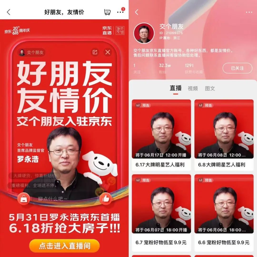 這不僅僅是一次618的營銷造勢,也標志著交個朋友完成“抖音+淘寶+京東”三平臺直播布局。早在4月初,交個朋友官方賬號已經(jīng)在京東直播上試水,5月20日之后,交個朋友每天都開播。而羅永浩作為特邀嘉賓,只會在618期間貢獻其中三場直播。