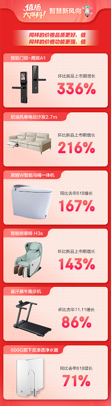 此外,京東京造鷹眼A1智能門鎖、奶油風單電動沙發(fā)、暴汗犀牛跑步機分別實現(xiàn)環(huán)比新品上市期增長336%、216%、86%,也在智能家居領域實現(xiàn)新品即爆品的市場突破。
