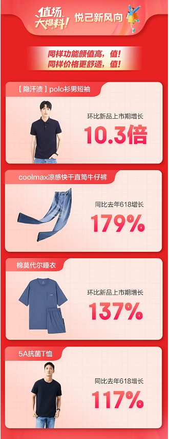 Coolmax涼感快干直筒牛仔褲,同比去年618增長179%。在Coolmax技術加持下,該款產品在高溫下也能保持干爽舒適的狀態(tài),助力消費者盡情享受夏日的自由。