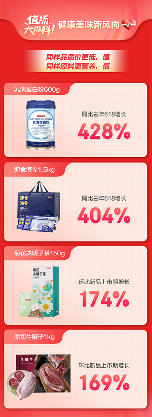 在健康飲食板塊,乳清蛋白粉成為追求健康和塑身的人士的理想選擇。開門紅28小時內,京東京造乳清蛋白粉,總成交額同比去年618增長 428%。此外,菊花決明子茶和原切牛腱子分別環(huán)比新品上市期增長174%、169%。
