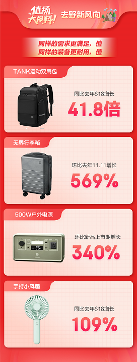開門紅28小時, TANK運動雙肩包同比去年618增長41.8倍,無界行李箱環(huán)比去年京東11.11增長569%,500W戶外電源環(huán)比新品上市期增長340%。