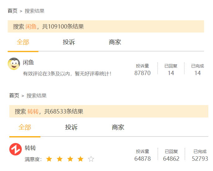 不僅僅是在電訴寶上,在另一消費者投訴平臺黑貓投訴上,目前關(guān)于閑魚的投訴已高達(dá)8萬多條,但閑魚針對大量投訴的回復(fù)量和已完成投訴量只有14條,這和轉(zhuǎn)轉(zhuǎn)對投訴處理的高回復(fù)形成了巨大的反差。