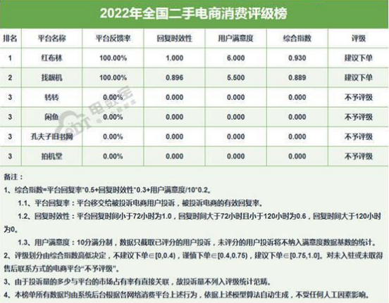 結(jié)合第三方平臺電訴寶發(fā)布的最近兩年全國二手電商消費評價榜來看,該平臺連續(xù)兩年給到閑魚的評級均為“不予評級”,這和找靚機、紅布林連續(xù)兩年收獲“建議下單”的評級形成了巨大的反差。