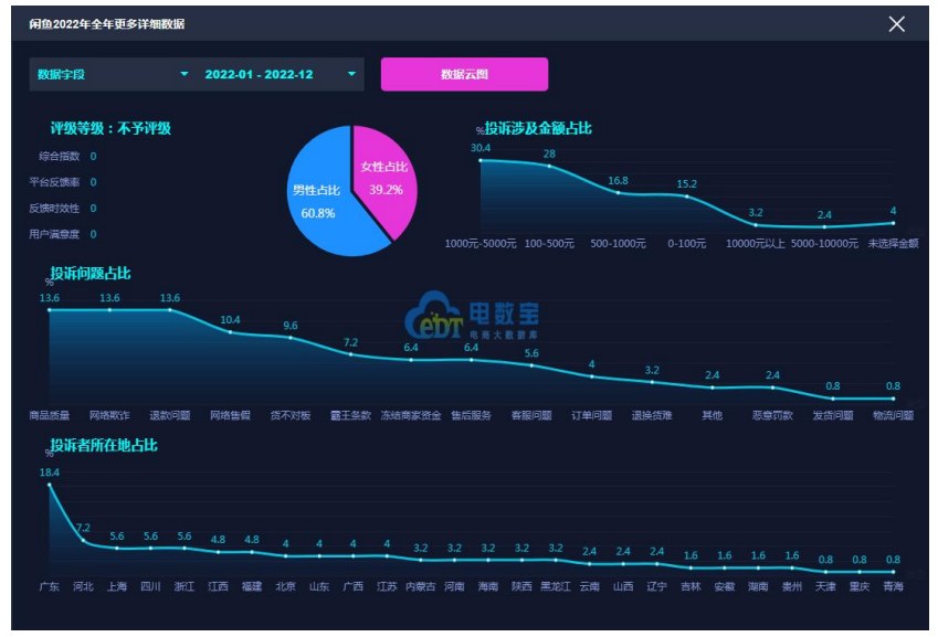 2022年,“閑魚”涉嫌存在商品質(zhì)量、網(wǎng)絡(luò)欺詐、退款問題、網(wǎng)絡(luò)售假、貨不對板、霸王條款、凍結(jié)商家資金、售后服務(wù)、客服問題、訂單問題、退換貨難、惡意罰款、發(fā)貨問題、物流問題等問題。而從投訴金額來看,集中在1000元-5000元的價格帶。