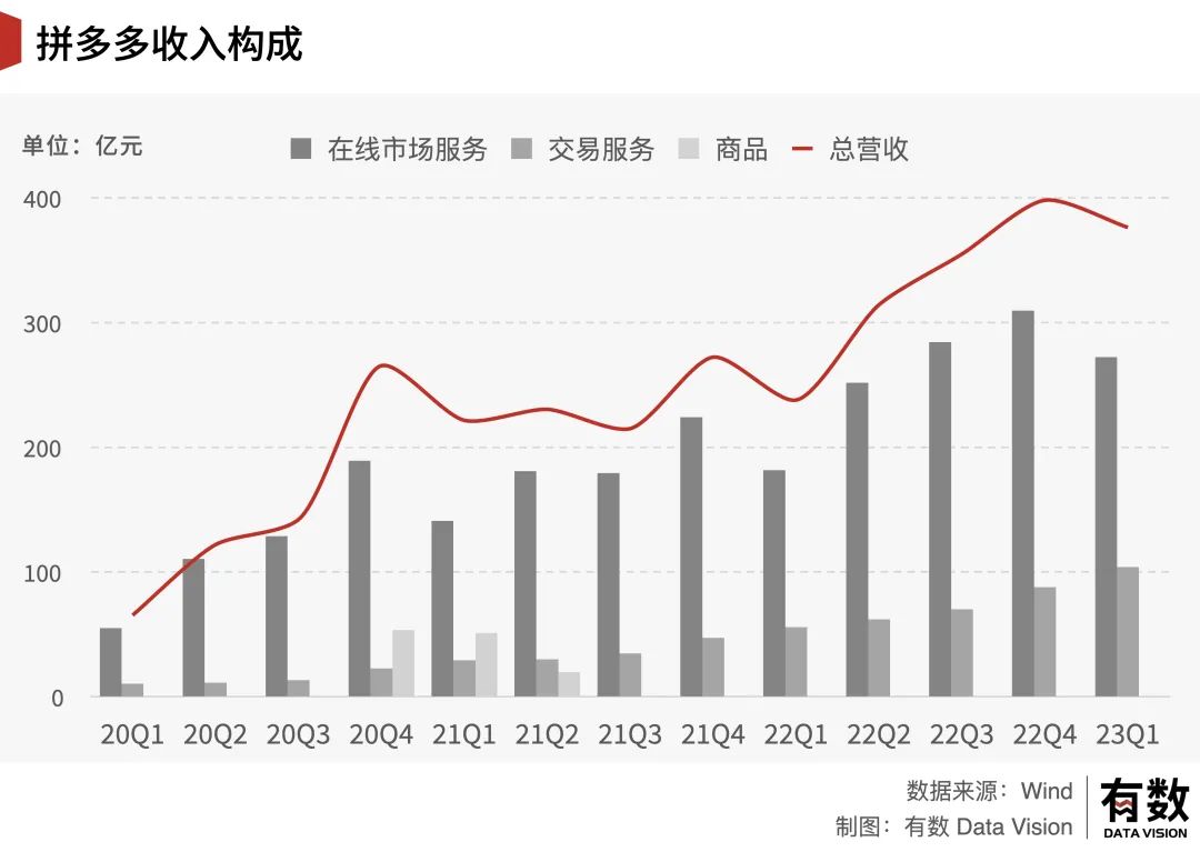 但在這季財(cái)報(bào)里,拼多多的交易服務(wù)收入(傭金)和營(yíng)銷(xiāo)服務(wù)收入(電商廣告)都在高速增加。其中,傭金收入為104億元,同比增長(zhǎng)86%,電商廣告收入實(shí)現(xiàn)272億元,同比增速高達(dá)50%。