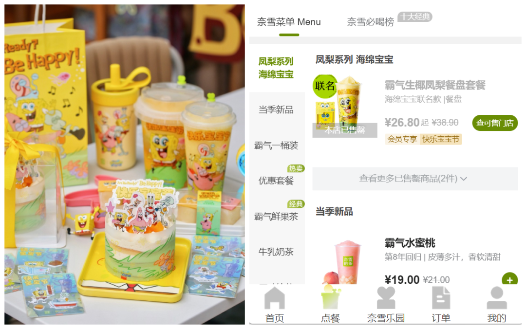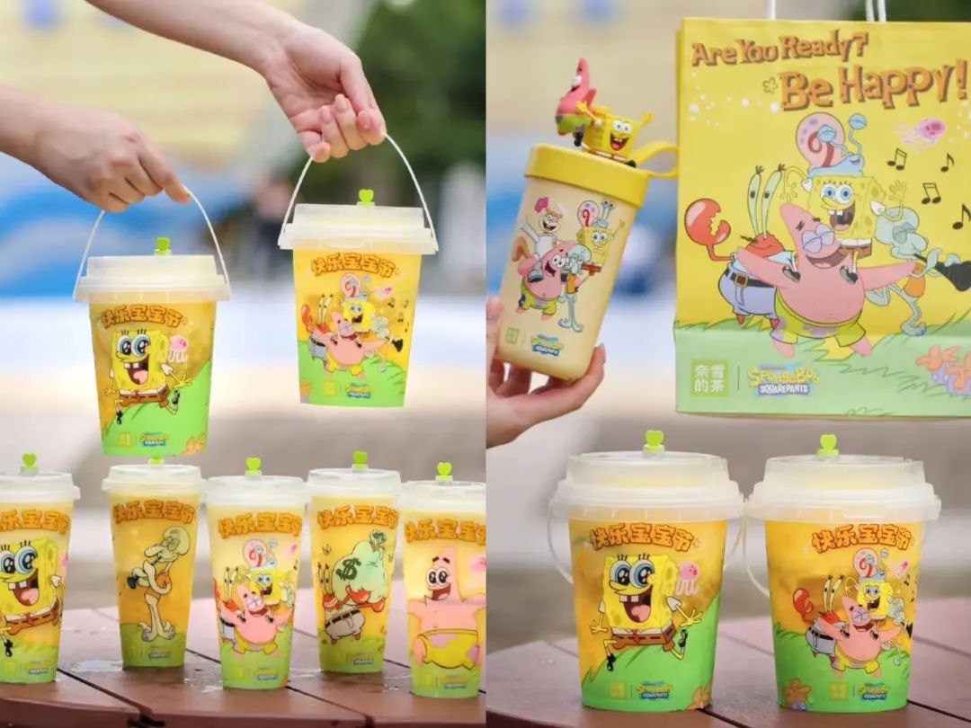 5月29日,奈雪官宣與海綿寶寶發(fā)起“快樂寶寶節(jié)”,購買生椰鳳梨新品,就能獲得IP聯(lián)名保溫杯、貼紙、手提袋、音樂泡泡機等周邊。