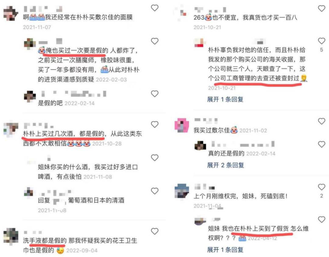 如在女性用戶居多的小紅書平臺,不少網(wǎng)友稱自己在樸樸超市買到的化妝品是假貨。