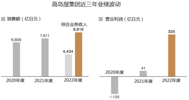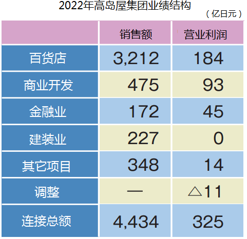 2022年集團(tuán)綜合業(yè)務(wù)收入為8818億日元,主業(yè)銷售額為4434億日元,營(yíng)業(yè)利潤(rùn)為325億日元。其中,百貨店部分銷售額為3212億日元,占主營(yíng)收入72.4%,營(yíng)業(yè)利潤(rùn)為184億日元,占主營(yíng)收入56.6%。由于改變會(huì)計(jì)核算準(zhǔn)則,百貨店同比銷售額下降,營(yíng)業(yè)利潤(rùn)增長(zhǎng)。