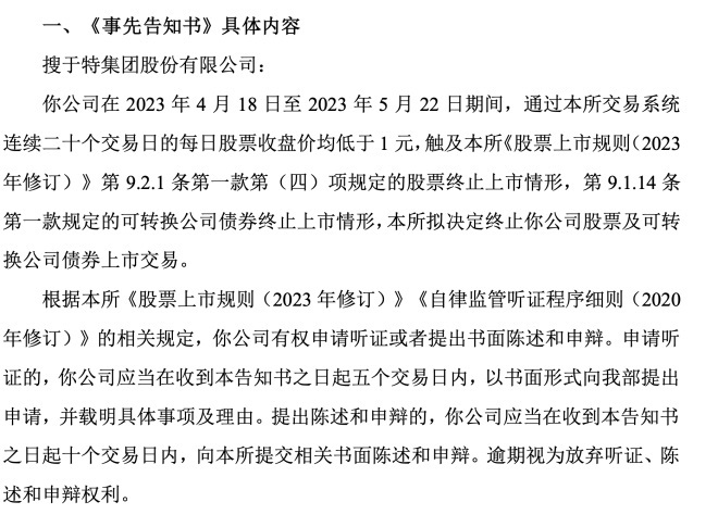 5月29日晚間,搜于特發(fā)公告稱公司收到深圳證券交易所下發(fā)的《事先告知書》,公司股票及可轉(zhuǎn)換公司債券存在將被終止上市的風(fēng)險(xiǎn)。