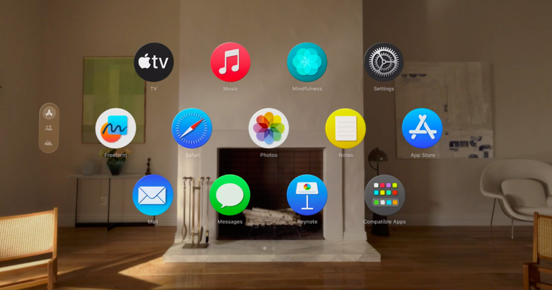 外觀設(shè)計(jì)上,Vision Pro就像一個(gè)滑雪護(hù)目鏡。用戶戴上之后,不僅能看到虛擬世界的頁面,各種APP都呈現(xiàn)在眼前,還能看到現(xiàn)實(shí)世界的事物,只用視線配合手勢或語音就可以進(jìn)行APP控制。
