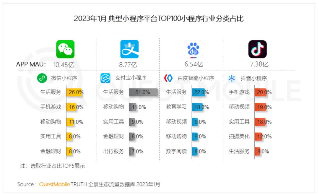 其實(shí),BAT小程序的差距,并不在用戶量級(jí)上。QuestMobile的報(bào)告顯示,截止2023年1月,微信、支付寶、抖音及百度APP月活躍用戶數(shù)分別達(dá)到10.45億、8.77億、7.38億和6.54億,基本位于同一量級(jí)。