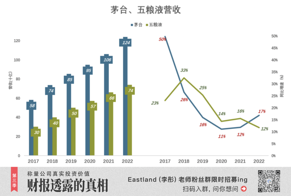 五糧液營收增速于2018年沖高到33%之后,回落較快,2022年?duì)I收740億、同比增速不到12%。