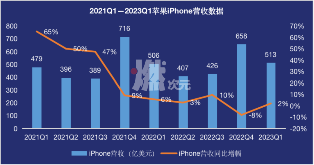 2023年第一季度(時(shí)間為自然年,以下未標(biāo)注則同)的蘋果財(cái)報(bào)中,iPhone實(shí)現(xiàn)營(yíng)收513億美元,高于彭博預(yù)期的489億美元。而在財(cái)報(bào)披露前,IDC已經(jīng)披露了本季度全球智能手機(jī)同比下降14.6%,蘋果同期出貨量?jī)H下滑2.3%,已經(jīng)遠(yuǎn)優(yōu)于行業(yè)水平。