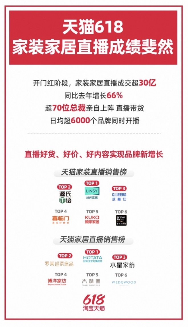 天貓618家裝家居70位總裁開播 開門紅直播成交超30億