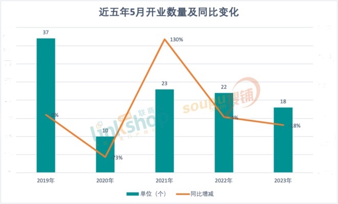 繼4月開(kāi)出36個(gè)新商業(yè)項(xiàng)目后,今年5月新開(kāi)商業(yè)項(xiàng)目數(shù)量也有18個(gè),在今年前五個(gè)月的單月開(kāi)業(yè)量上的表現(xiàn)也并不差。從近五年的數(shù)據(jù)情況上看,同比2022年下滑了18%。