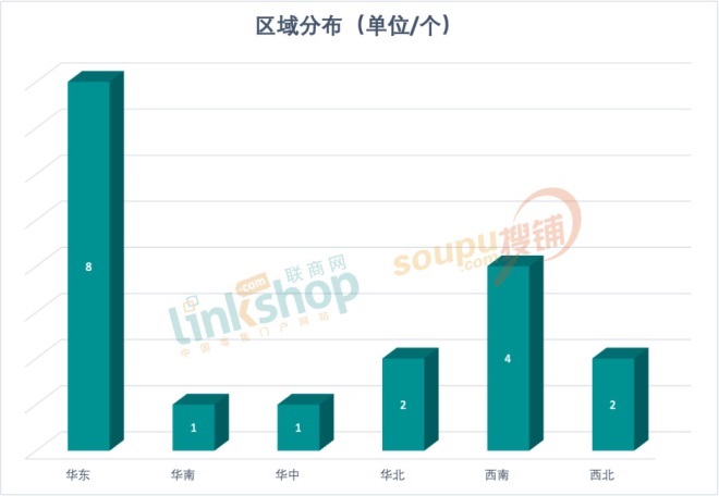 其中華東依然領(lǐng)先,有8個(gè)商業(yè)項(xiàng)目開(kāi)業(yè);西南則以4個(gè)商業(yè)項(xiàng)目緊隨其后。同為第三位的是華北和西北,各有2個(gè)。而華南和華中各有1個(gè)商業(yè)項(xiàng)目開(kāi)業(yè)。