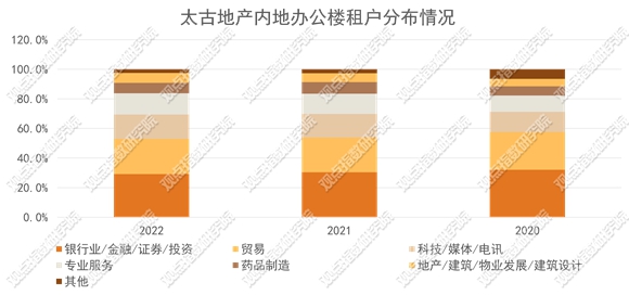 從上文可以發(fā)現(xiàn),金融業(yè)不僅是以上三個(gè)商圈辦公樓宇租戶(hù)的重要組成部分,也是太古地產(chǎn)三個(gè)辦公項(xiàng)目的重點(diǎn)租戶(hù)來(lái)源。公告數(shù)據(jù)顯示,目前太古地產(chǎn)辦公樓宇租戶(hù)結(jié)構(gòu)中排在首位的是金融行業(yè),其次是貿(mào)易。從三個(gè)項(xiàng)目的具體租戶(hù)來(lái)看,上海和廣州的辦公樓宇貢獻(xiàn)了較大比重的貿(mào)易類(lèi)企業(yè)租戶(hù)。