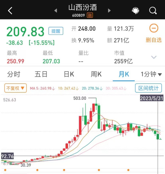 2021年5月31日,山西汾酒創(chuàng)造了上市以來的最高股價(jià)503元/股。但在兩年后的5月31日,山西汾酒迎來了209.83元的低點(diǎn),降幅接近60%。
