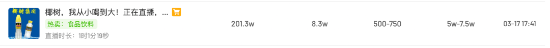 然而,數(shù)千萬人流在推高直播間熱度的同時,卻并未帶來產(chǎn)品的熱銷。數(shù)據(jù)顯示,椰樹集團海南椰汁飲料有限公司近三個月的銷售額在75萬元-100萬元,直播間銷量在1萬-2.5萬。以3月17日的一場直播為例,1個小時的直播就有200萬人次沖進直播間,但是銷售額卻只有5萬元-7.5萬元,平均每人僅消費0.03元。