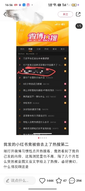 來自河南鄭州的小王就發(fā)過小紅書吐槽,她曾經(jīng)在小紅書上發(fā)過一篇筆記,原本在小紅書瀏覽量并不出眾,但在幾個月后被某個自媒體博主搬運到了微博,還沖上了總榜熱搜第二。