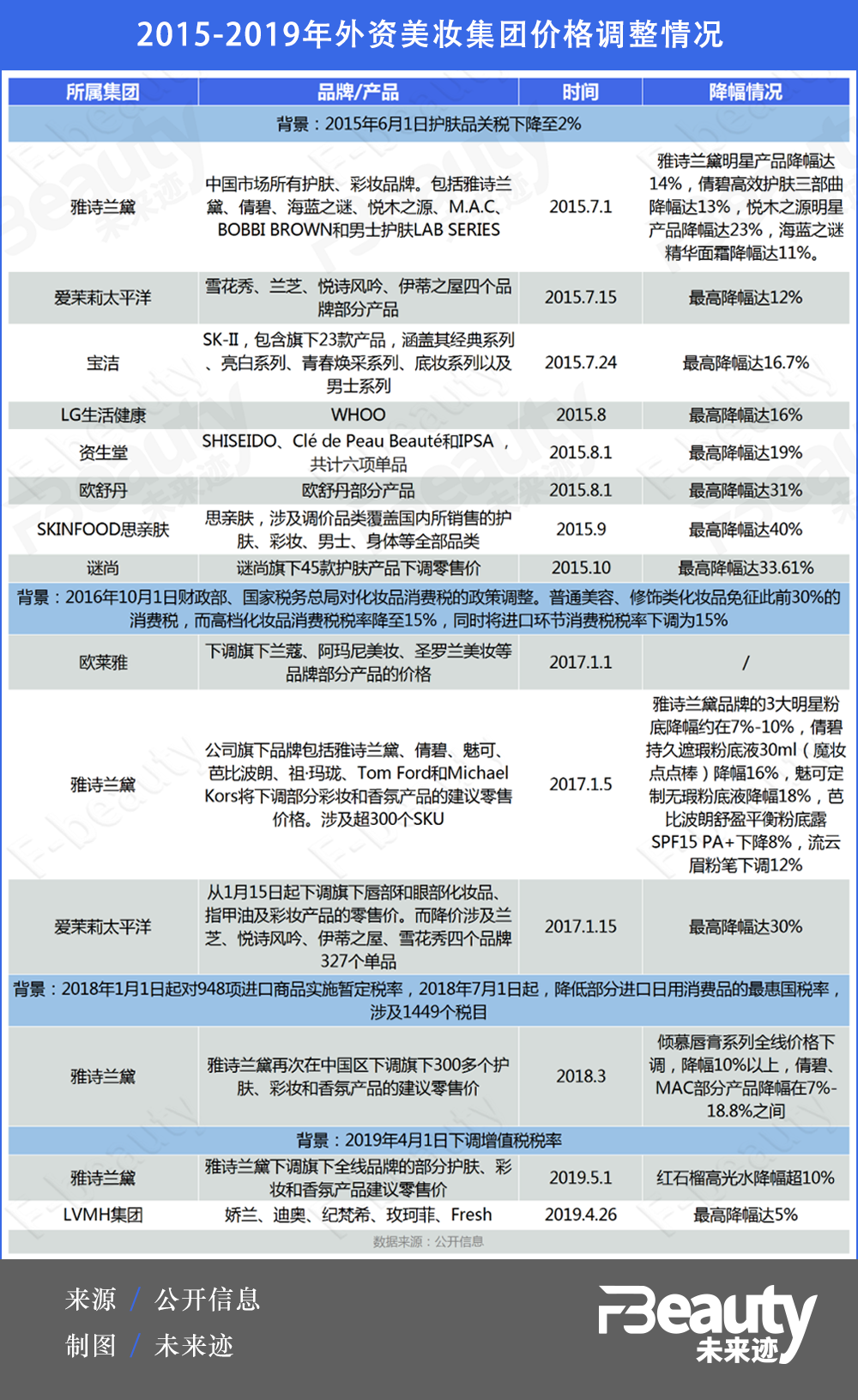 比如在2015年—2019年期間,由于我國頻繁下調進口化妝品關稅及消費稅,雅詩蘭黛、歐萊雅、愛茉莉太平洋、寶潔、歐舒丹等一眾外資集團就呈現(xiàn)出降價的大趨勢。