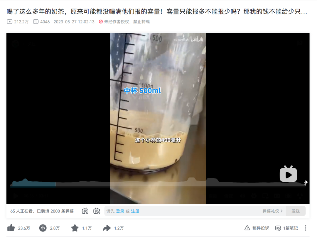 這條引起軒然大波的視頻,標(biāo)題叫《喝了這么多年的奶茶,原來可能都沒喝滿他們報(bào)的容量!容量只能報(bào)多不能報(bào)少嗎?那我的錢不能給少只能給多嗎?》。