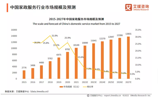 據(jù)艾媒咨詢統(tǒng)計(jì)顯示,從2015年到2021年,中國(guó)家政服務(wù)市場(chǎng)規(guī)模由2776億元增至10149億元,增長(zhǎng)近4倍,預(yù)計(jì)2023年將達(dá)到11641億元,從業(yè)人員超過4000萬人。