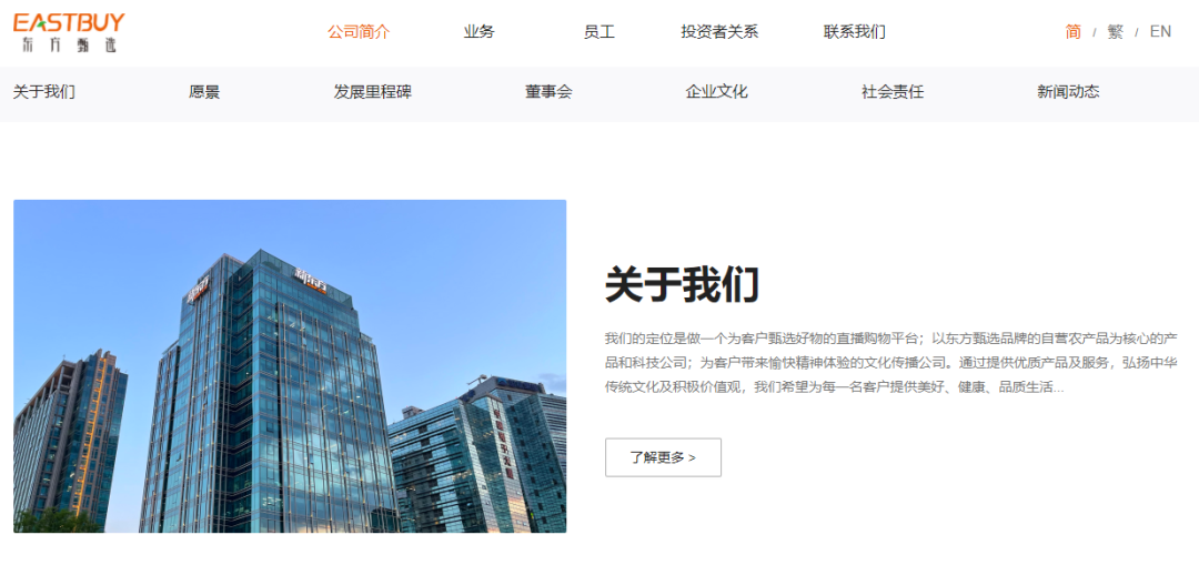 在東方甄選官網(wǎng)的業(yè)務(wù)介紹中,“自營產(chǎn)品及直播電商”被排在了首位,而后才是“大學(xué)教育”“機(jī)構(gòu)客戶”等。