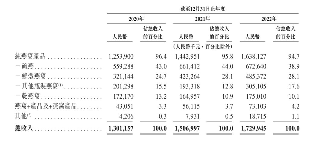 其中,純燕窩產(chǎn)品主要包括碗裝燕窩產(chǎn)品系列「碗燕」、主要供應(yīng)電商消費(fèi)者的瓶裝燕窩產(chǎn)品系列「鮮燉燕窩」、瓶裝冰糖口味燕窩產(chǎn)品系列「冰糖官燕」、可供客戶自行加工的傳統(tǒng)燕窩產(chǎn)品系列「干燕窩」等;「燕窩+」產(chǎn)品指以燕窩為基底、添加了額外成分以增強(qiáng)風(fēng)味及適應(yīng)不同消費(fèi)場(chǎng)景的燕窩產(chǎn)品;而「+燕窩」產(chǎn)品則包括使用燕窩或燕窩提取物以增強(qiáng)風(fēng)味和功能的食品(如燕窩粥)、以及使用燕窩肽作為核心成分的燕窩護(hù)膚品。