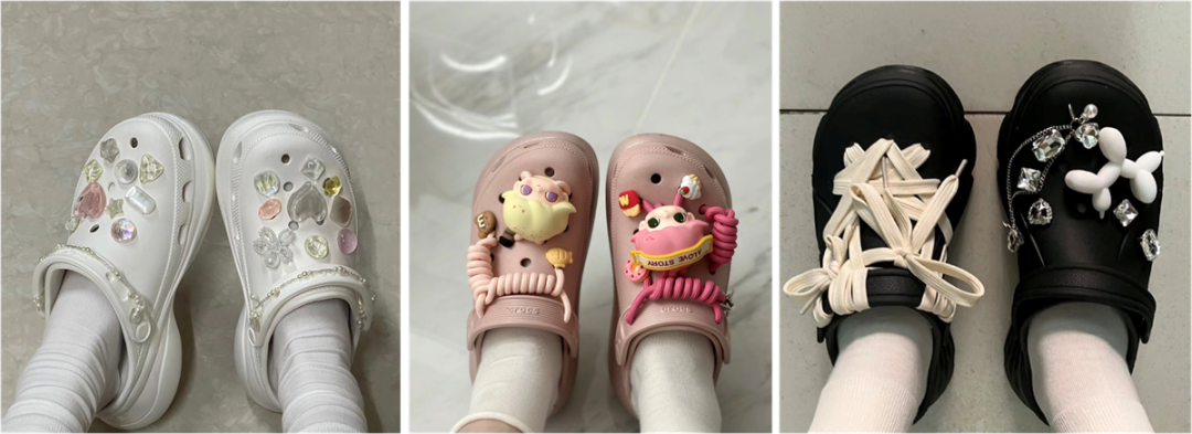 在小紅書(shū)等社交媒體平臺(tái)上,點(diǎn)進(jìn)標(biāo)題為“交出你們的鞋花”的各種帖子,其中曬出的鞋花造型多變:有亮閃閃的水晶石塊,有毛茸茸的玩偶甜系風(fēng),有裝飾了金屬鏈子的機(jī)車風(fēng)……