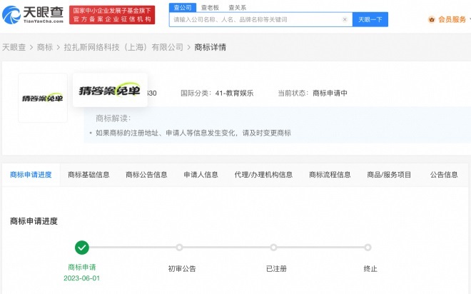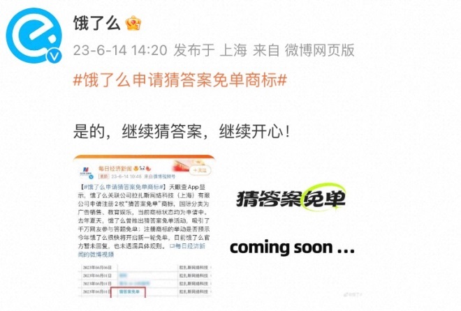 6月14日消息,天眼查App顯示,餓了么關(guān)聯(lián)公司拉扎斯網(wǎng)絡(luò)科技(上海)有限公司申請注冊2枚“猜答案免單”商標,國際分類為廣告銷售、教育娛樂,當前商標狀態(tài)均為申請中。網(wǎng)友猜測,餓了么注冊商標的舉動預示今年的新一輪免單活動將很快開啟。