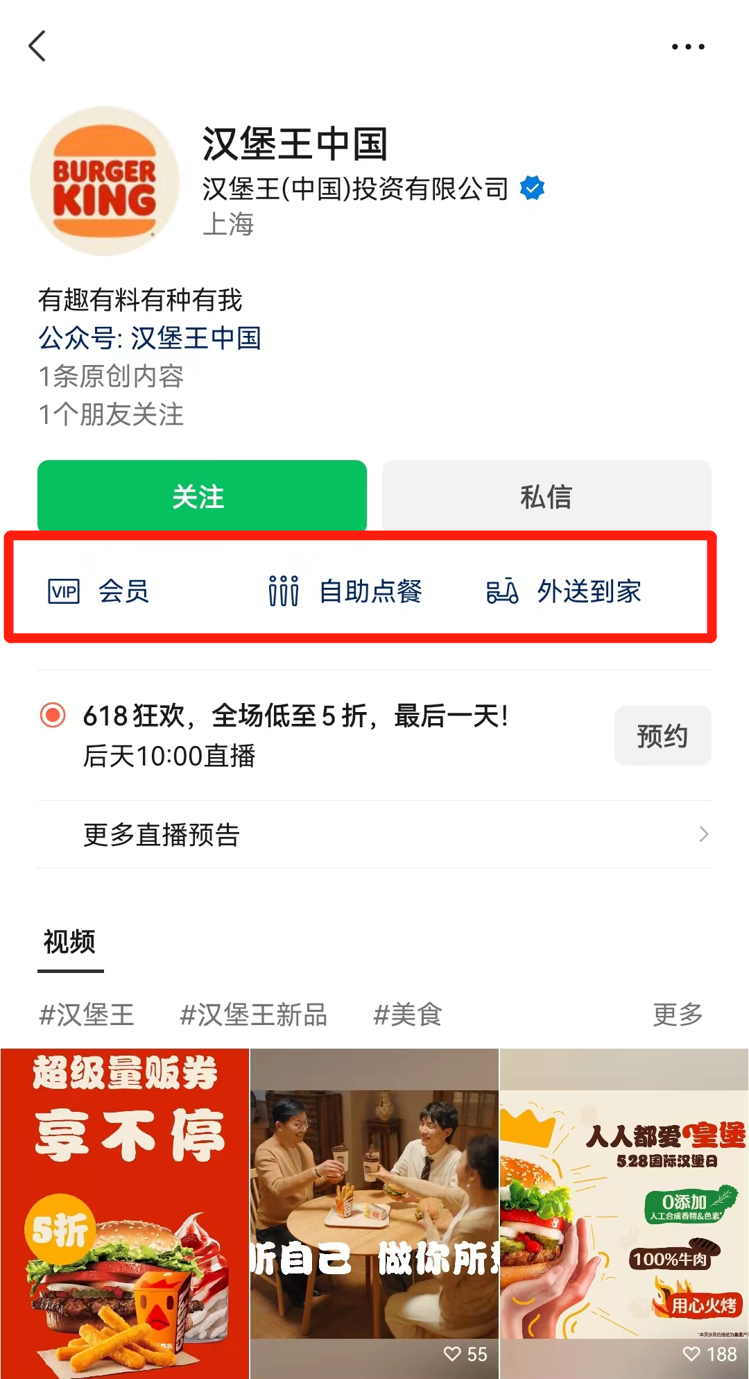以商家漢堡王為例,其視頻號(hào)主頁(yè)下,新增的本地生活組件可分為:會(huì)員、自助點(diǎn)餐、外送到家。