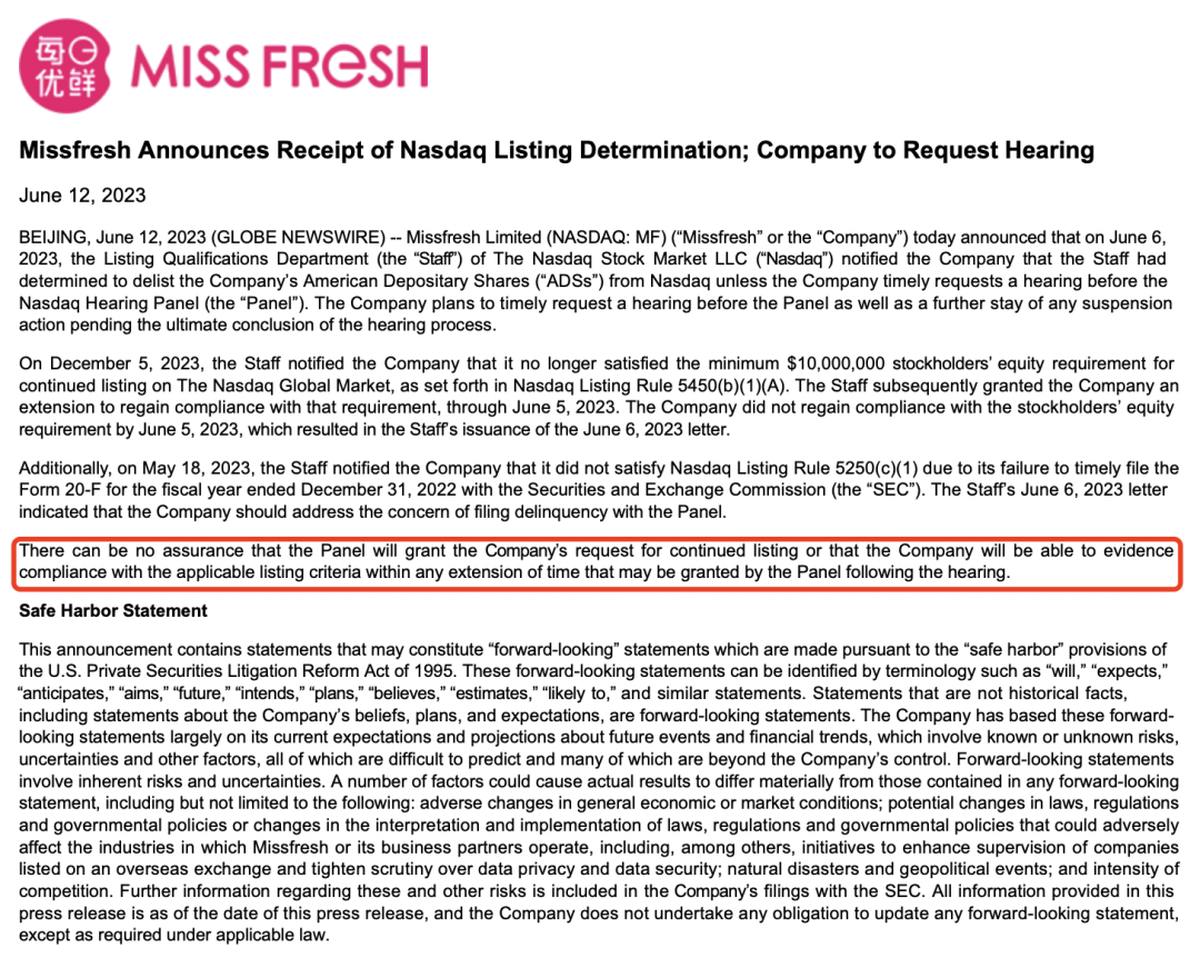 6月13日,“生鮮電商第一股”每日優(yōu)鮮宣布收到納斯達(dá)克股票市場(chǎng)上市資格部通知,決定將其美國(guó)存托股票從納斯達(dá)克摘牌,除非公司及時(shí)要求舉行聽(tīng)證會(huì)。